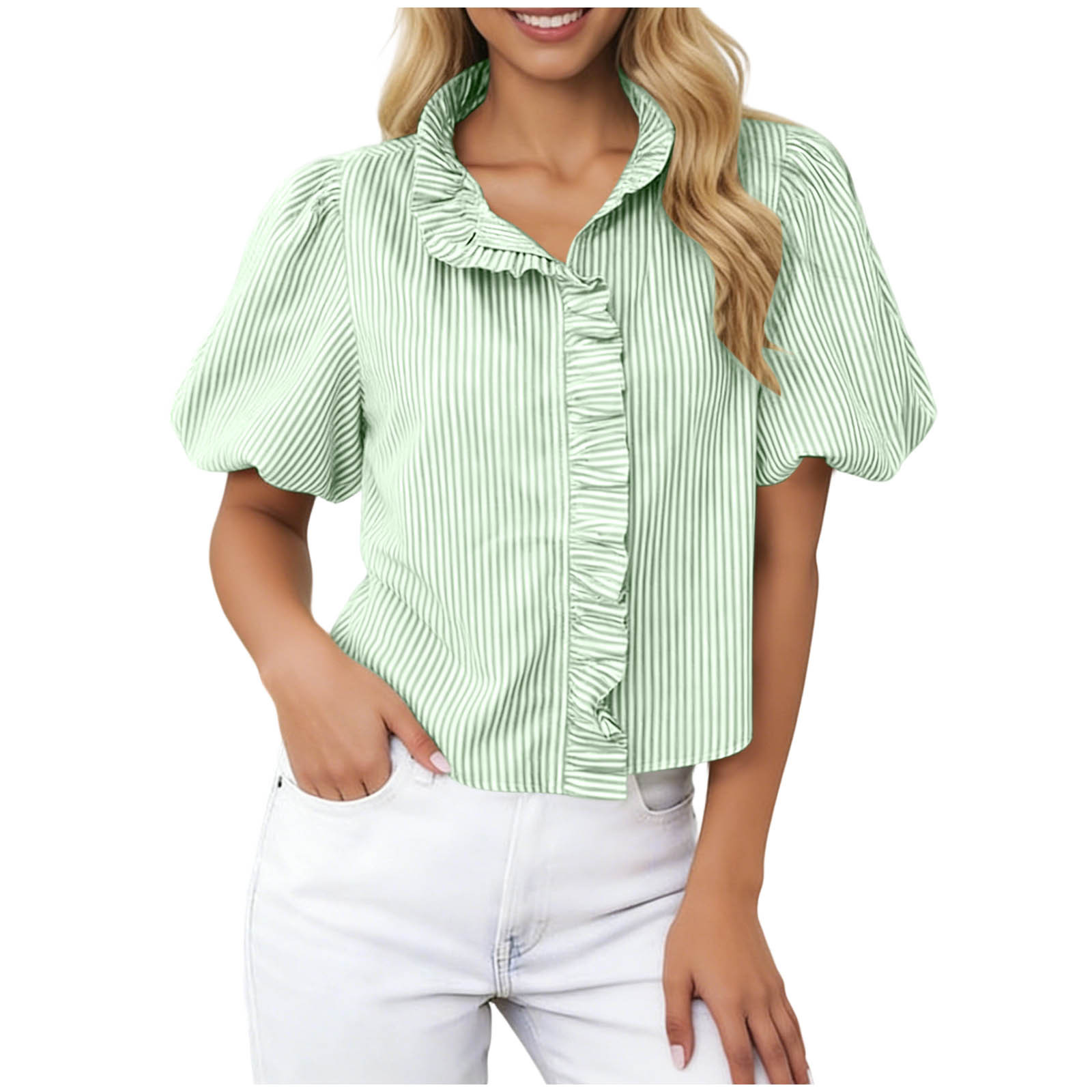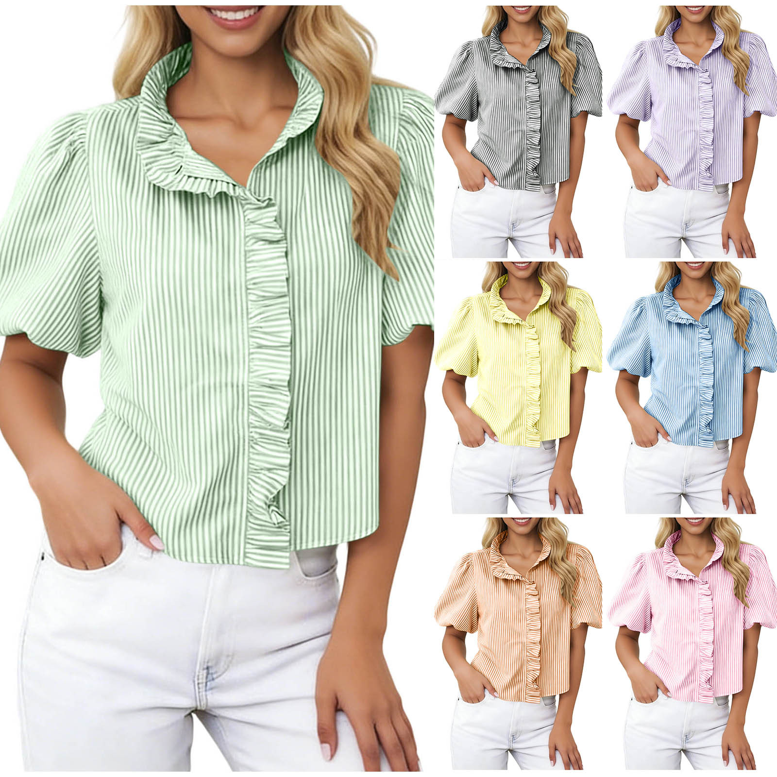 Features: Ruffle trim, Patchwork, Pleated details, Wrinkle texture, Puff sleeves, Stand collar, Loose fit